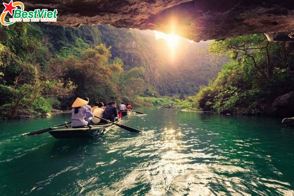 14h00: Xe đưa quý khách ra bến Tràng An, lên thuyền thăm Khu du lịch sinh Thái Tràng An - nơi những dải đá vôi, thung lũng và những sông ngòi đan xen tạo nên một không gian huyền ảo, kỳ bí. Ngồi trên thuyền tham quan các hang động với những hình thù nhũ đá rất đặc sắc như: Hang tối, hang sáng, hang nấu rượu, hang sính, hang si, hang ba giọt, hang địa linh…
